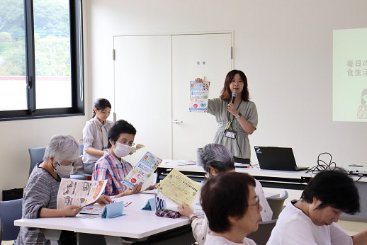 別府市健康推進課の管理栄養士・三根さんを講師に迎え、現代の食生活の現状や課題、 忙しい日の工夫メニューなどを学びました。