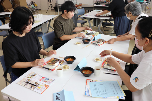 講話後は別府市健康推進課とコープのコラボメニュー「まごころ弁当」とみんなのスペース「ぽっかぽか」のみなさんがつくった栄養満点のミネストローネや芋餅を試食し、健康的な食の大切さを実感しました。