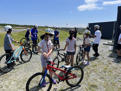 釣師防災緑地公園でパンプトラックの体験、防災公園としての役割の説明を聞きました。パンプトラックとは波打ったコースを自転車、スケボーなどでコースを走るアクティビティの事です。このパンプトラックは国際競技にも対応できるレベルのコースで遠くは静岡県からの利用者や公式大会も開催されています。はじめに注意点と簡単なレクチャーを受け、実際にコースを走った子どもたちは、怖がりながらも走り始め、徐々に足を着かずに笑顔でゴールできるようになり、最後には楽しそうな表情へと変わっていきました。