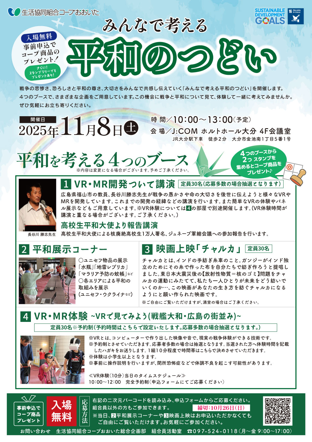 | 内容 | 戦後80年を迎える今、あらためて「戦争と平和」について知り、感じ、語り合う機会にしませんか。 会場は4つのブースに分かれ、①VR・MRを開発についての講話と高校生平和大使による報告講演 ②戦争や平和に関する展示 ③チャルカの映画上映 ④VR・MR体験 を行います。各ブースを巡りながら平和を見つめ直し、未来へ繋げていきましょう。 |