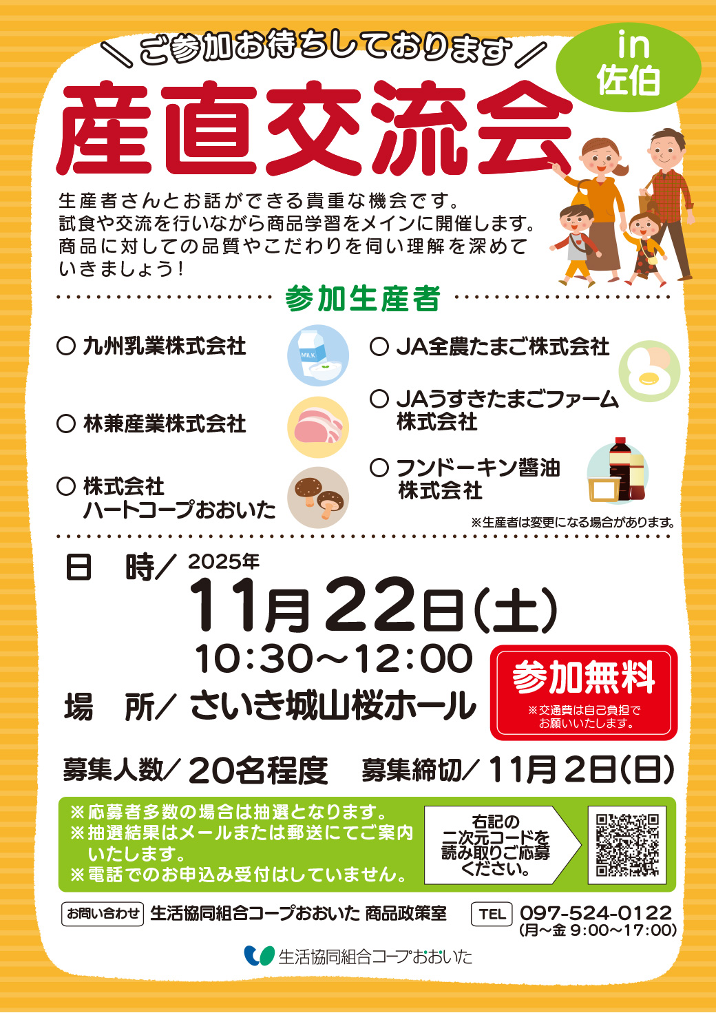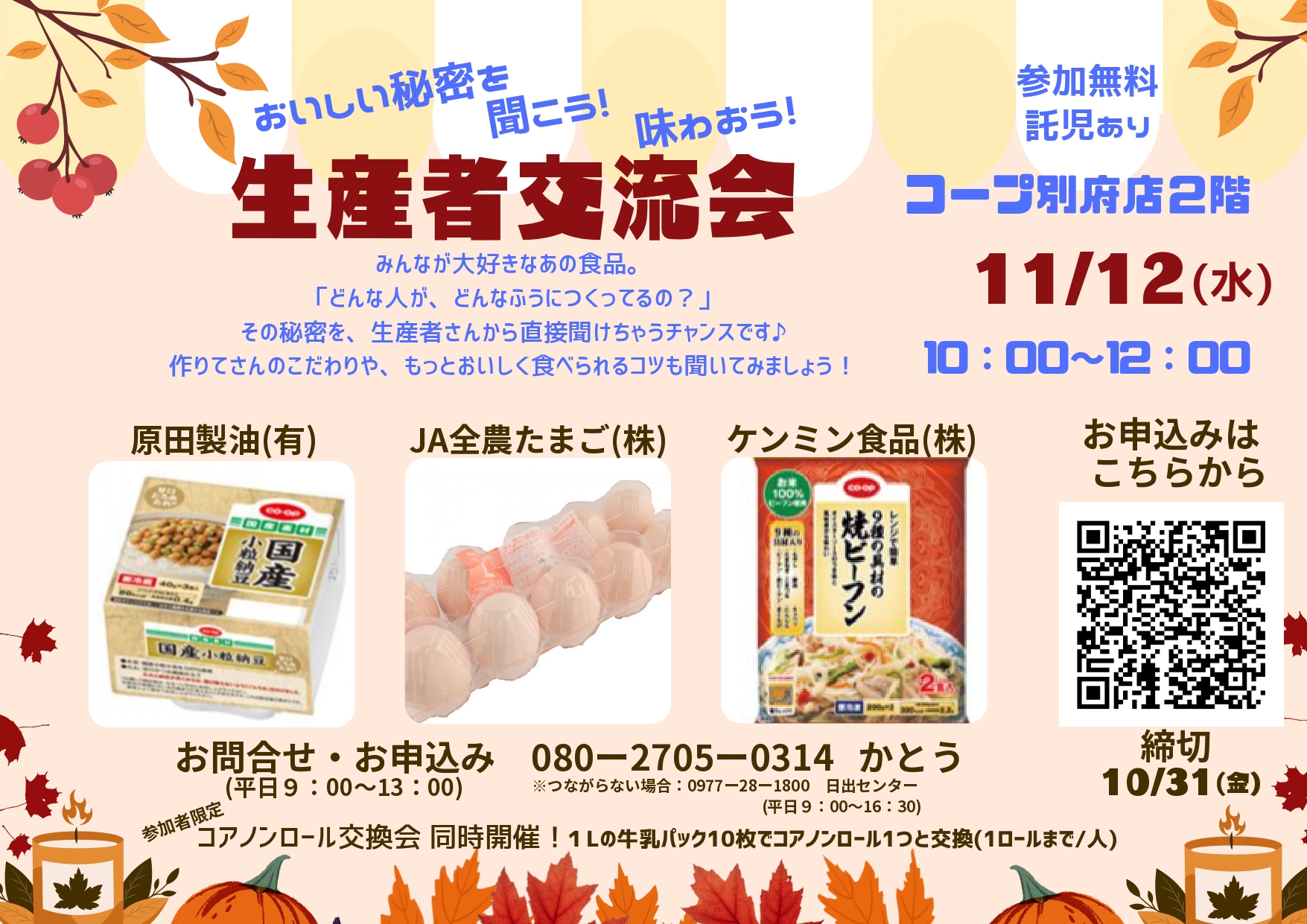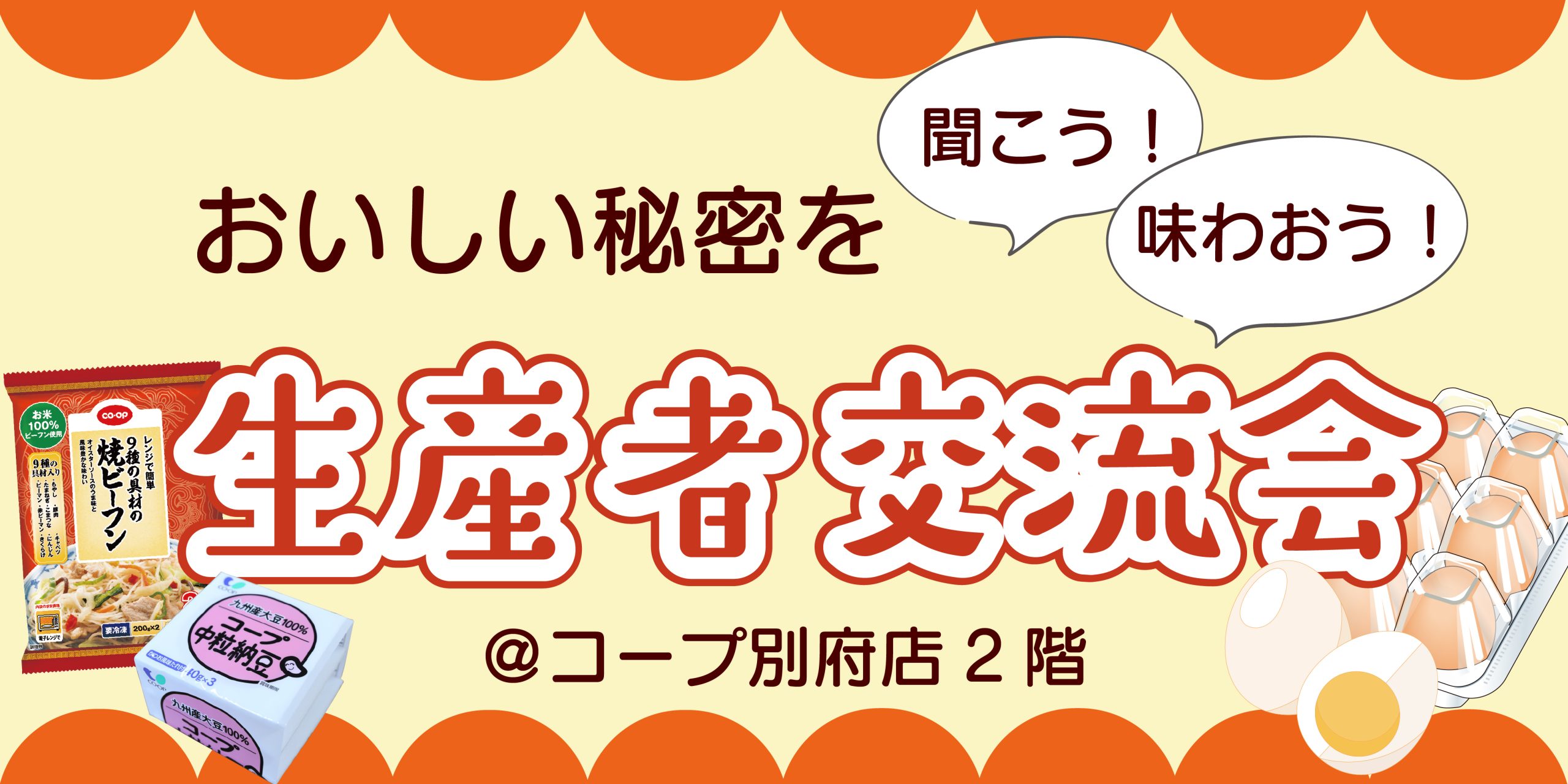 | 内容 | コープおおいたの産直商品やエシカル、コープ商品について学びます。実際 に生産者さんやメーカーさんと交流できる貴重な機会です。おいしい試食 を食べながら、一緒に商品についての知識を深めませんか? 〈参加予定生産者・メーカー〉 (株)九州乳業、JA全農たまご(株)&うすきたまごファーム、林兼産業(株)、フンドーキン醬油(株)、(株)ハートコープおおいた |