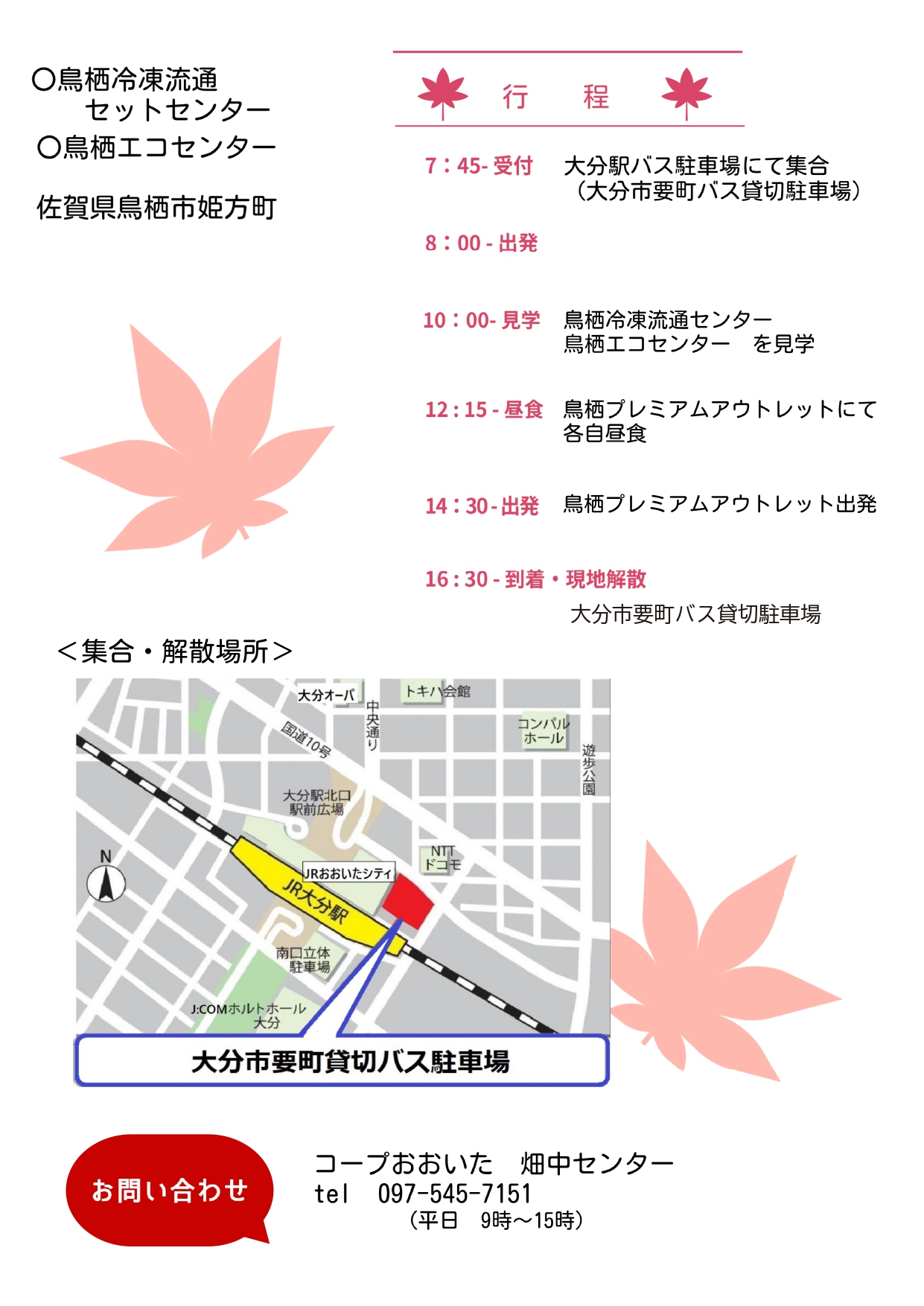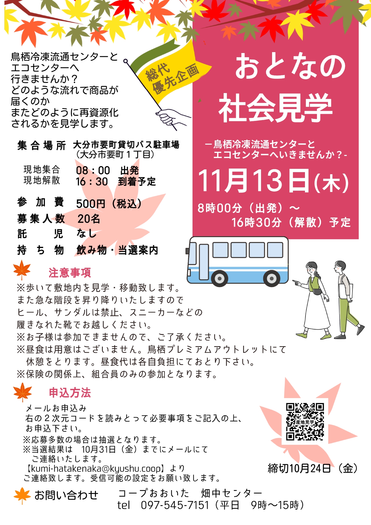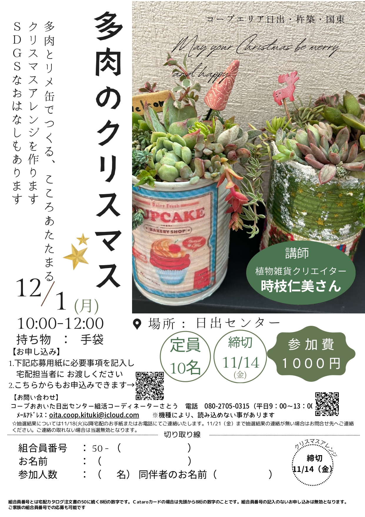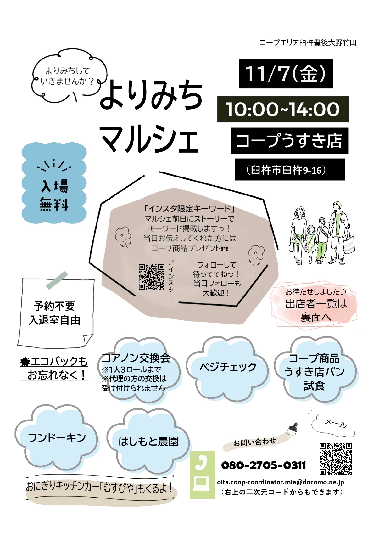 | 内容 | コープおおいたの産直商品やエシカル、コープ商品について学びます。実際 に生産者さんやメーカーさんと交流できる貴重な機会です。おいしい試食 を食べながら、一緒に商品についての知識を深めませんか? 〈参加予定生産者・メーカー〉 (株)九州乳業、JA全農たまご(株)&うすきたまごファーム、林兼産業(株)、フンドーキン醬油(株)、(株)ハートコープおおいた |