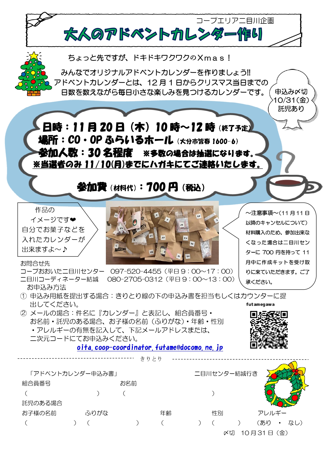 ※抽選結果については、10/20(月)以降、宅配のお手紙またはお電話にてご連絡いたします。10/24(金)まで抽選結果の連絡が無い場合は、お問い合わせ先へご連絡ください。
