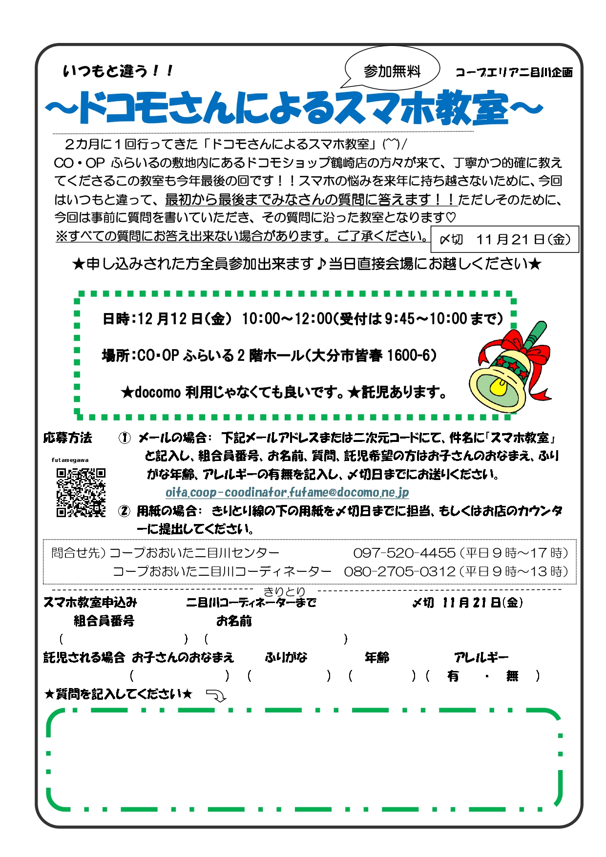 1.組合員番号2.お名前3.スマホに関する質問4.託児希望の場合はお子さんのお名前、フリガナ、年齢、アレルギーの有無