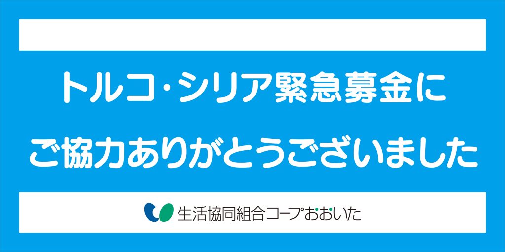 日本生活協同組合連合会を通じて日本ユニセフ協会から援助資金の支援要請があり、これを受けてコープおおいたでは、『トルコ・シリア緊急募金』を宅配と店舗にて取り組みました。