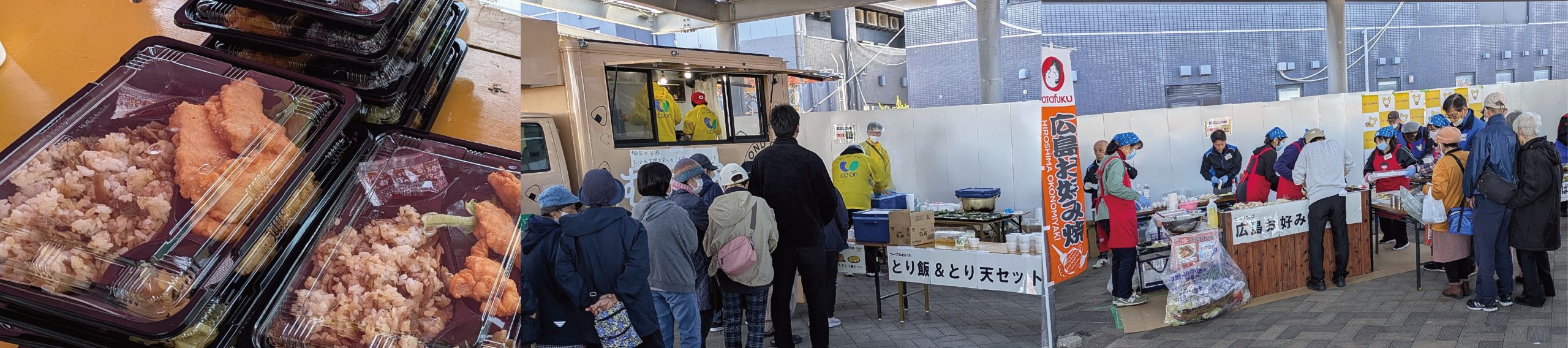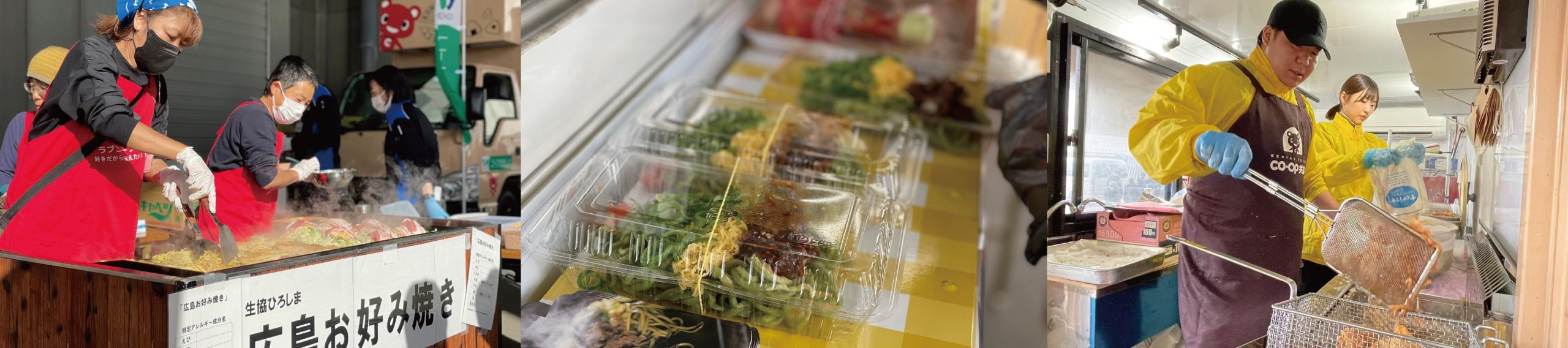 生協ひろしまはお好み焼き、コープやまぐちは瓦そば、コープいしかわはコーヒー・デザート、コープおおいたはとり天とり飯弁当・みそ汁を提供しました。
