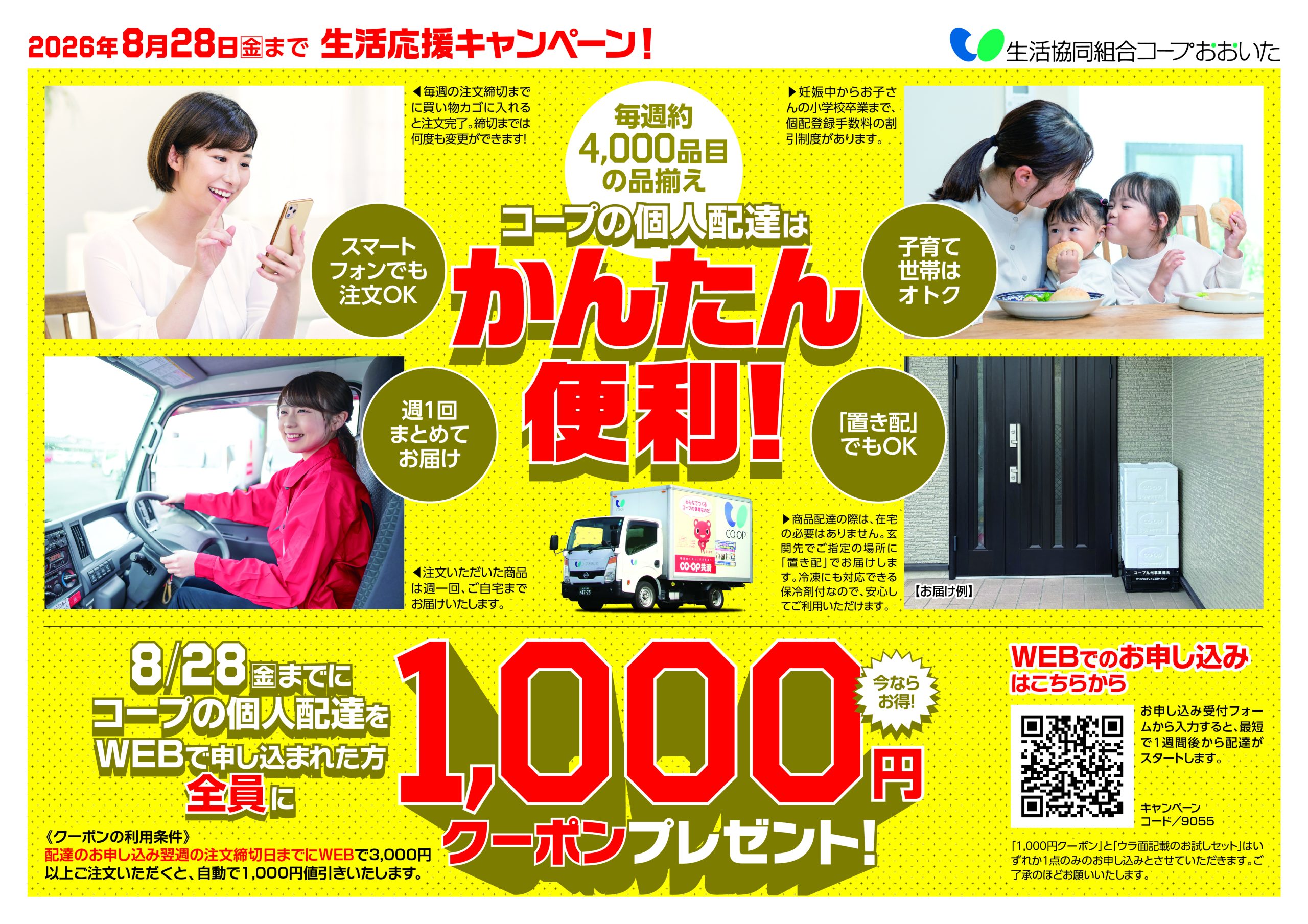 1000円クーポンプレゼント中!コープの個人配達はじめませんか? キャンペーン2026.04.16 今なら!宅配WEB加入で1000円クーポンプレゼント! 忙しい毎日に、玄関まで安心をお届け。 スマホから簡単注文!週に1回ご自宅まで配送いたします♪ お水やお米など重い物のお買い物も楽々! 冷凍食品や時短料理セットなど、忙しい家庭に役立つアイテムも多数取り揃えています。 今なら、すぐに使える1000円クーポンをプレゼント! この機会にコープの宅配、はじめてみませんか? 1000円クーポンプレゼント期間 2026年8月28日 まで コープの宅配について詳しくはこちら WEB加入はこちら おすすめ記事 キャンペーン 2025.05.07 店舗|父の日ご予約キャンペーン実施中! キャンペーン 2025.03.11 店舗|4月より組合員サービスデーが変わります! キャンペーン 2024.12.24 コープ共済|お誕生前申し込みはこちらから お知らせ 2024.12.16 宅配|新春お年玉企画 お知らせ 2024.11.01 店舗|迎春商品のご予約受付中!2025 キャンペーン 2024.05.13 店舗|父の日ご予約キャンペーン実施中! お知らせ一覧に戻る