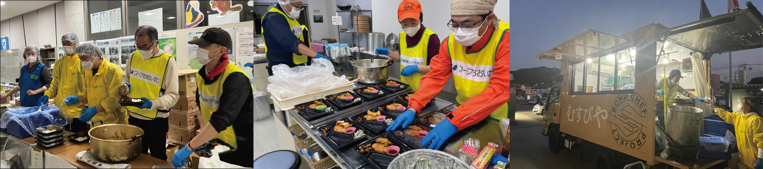 今回はNPO法人リエラ様を通じて、コープおおいた職員有志で結成されたCODRA(コドラ)による「キッチンカーむすびやによる炊き出し支援」を行います。