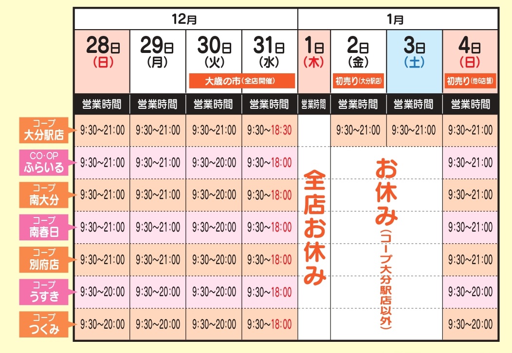 コープおおいた宅配・店舗の年末年始の営業スケジュールです。