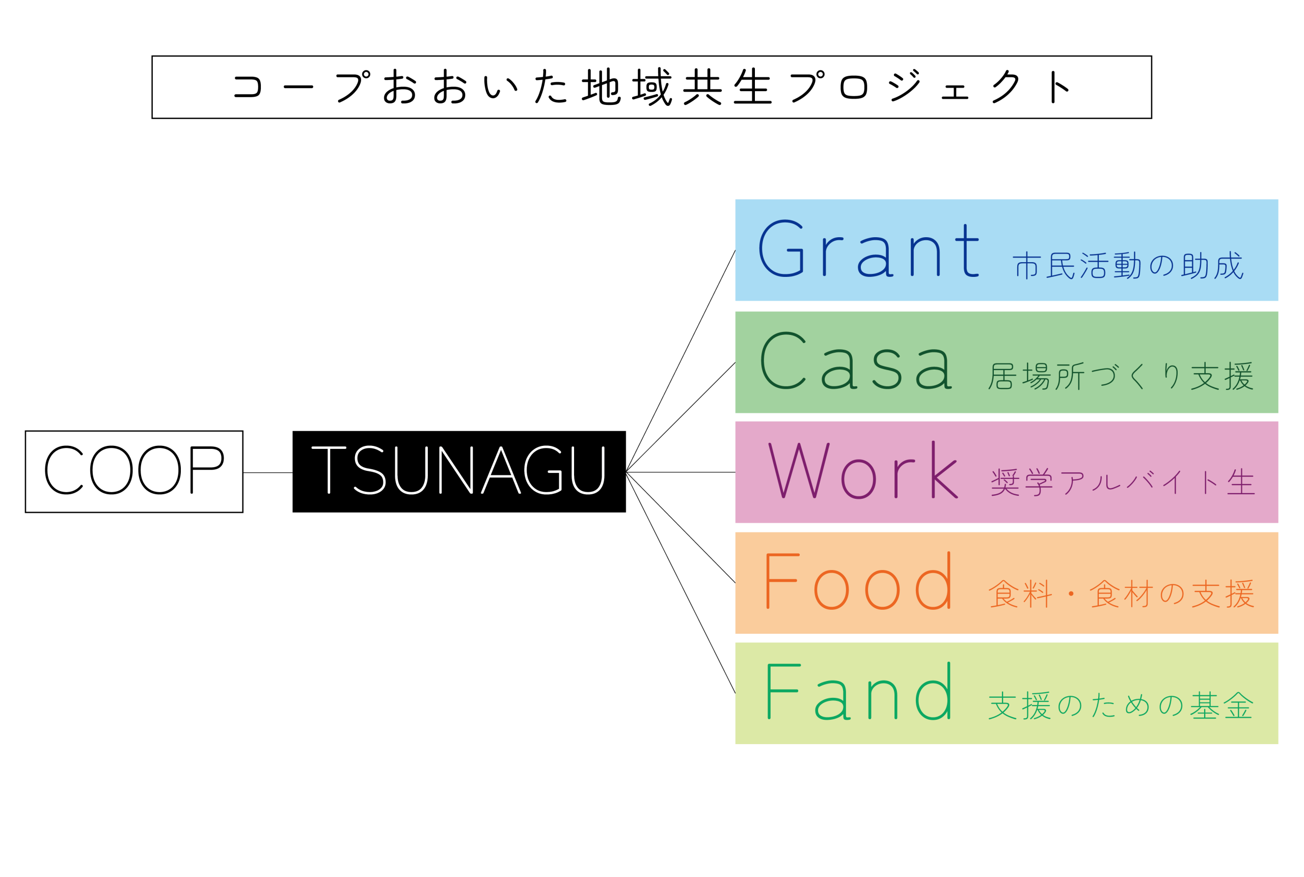 生活協同組合コープおおいたは、地域の誰もが安心して暮らせる社会を目指し、生活困窮者の支援を柱とした「コープおおいた地域共生プロジェクト」を立ち上げ、その中心に『COOP TSUNAGU(コープつなぐ)』を掲げました。