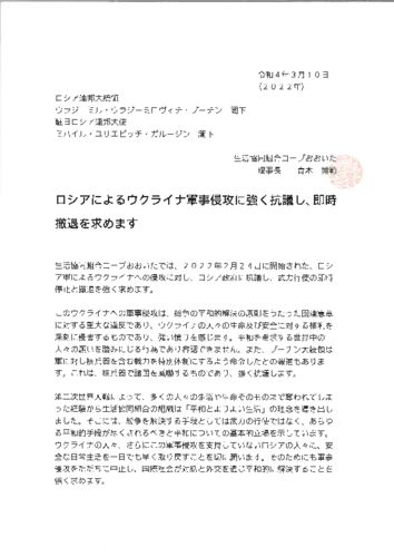 【緊急声明】ロシア軍によるウクライナ侵攻に強く抗議します ニュースリリース2022.03.10 コープおおいた組合員の皆さま ロシア軍によるウクライナへの侵攻が開始され尊い命が犠牲になっています。 コープおおいたは、ロシア軍の即時撤退を求める緊急声明文を在日ロシア大使館へ送付いたしました。 おすすめ記事 お知らせ 2025.12.01 令和6年能登半島地震被災者支援活動の報告 お知らせ 2023.03.01 豊後高田市と包括連携に関する協定を締結しました ニュースリリース 2022.11.29 コープおおいたはウクライナ避難民を支援します ニュースリリース 2022.06.27 フードパントリーへ食品を提供しました ニュースリリース 2019.04.11 《ニュースリリース》子育てイベント「親子で食レ… ニュースリリース 2019.03.06 【プレスリリース】復興支援イベント「しんけん、… お知らせ一覧に戻る