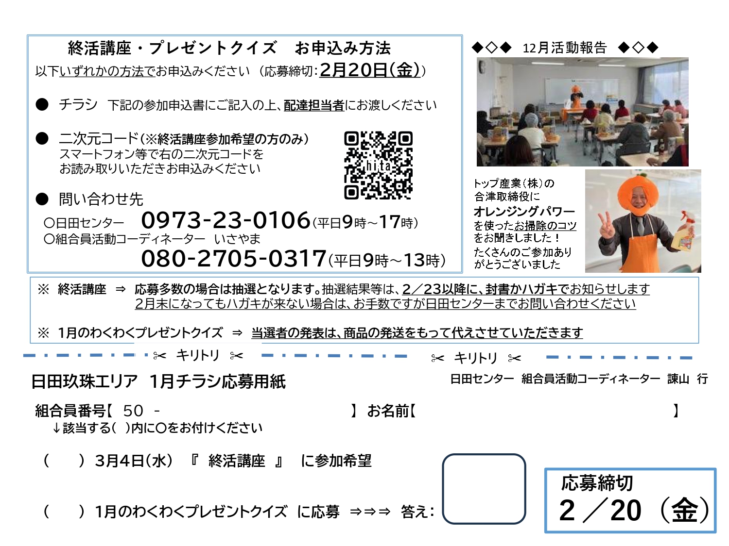 組合員活動コーディネーター 電話番号080-2705-0317(平日9時~13時)